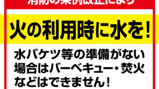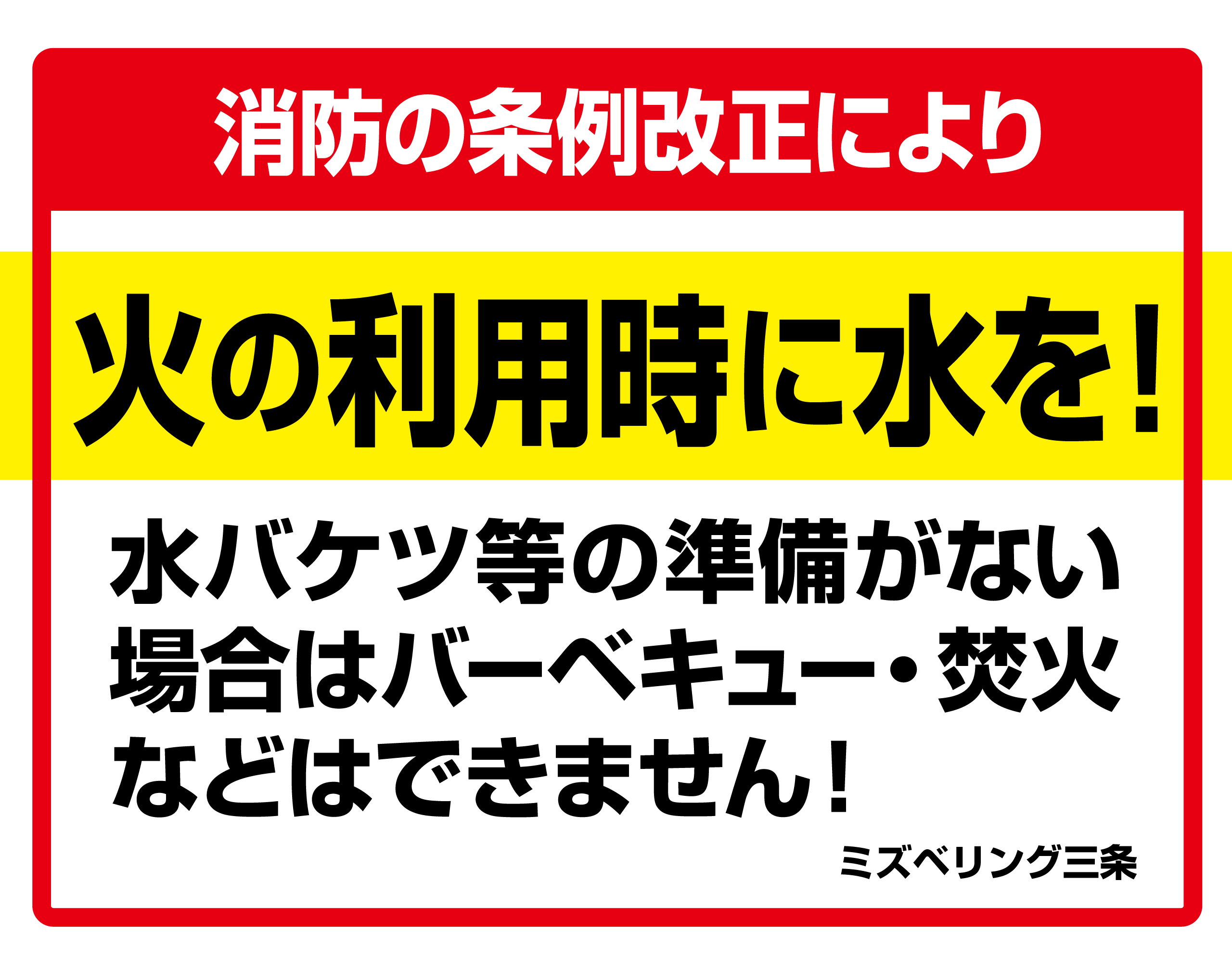 消防条例の改正に伴い、交流広場においてバーベキューや焚火など火気をご使用される際は、必ず水を入れたバケツや消火器等をご用意いただきますようお願いいたします。