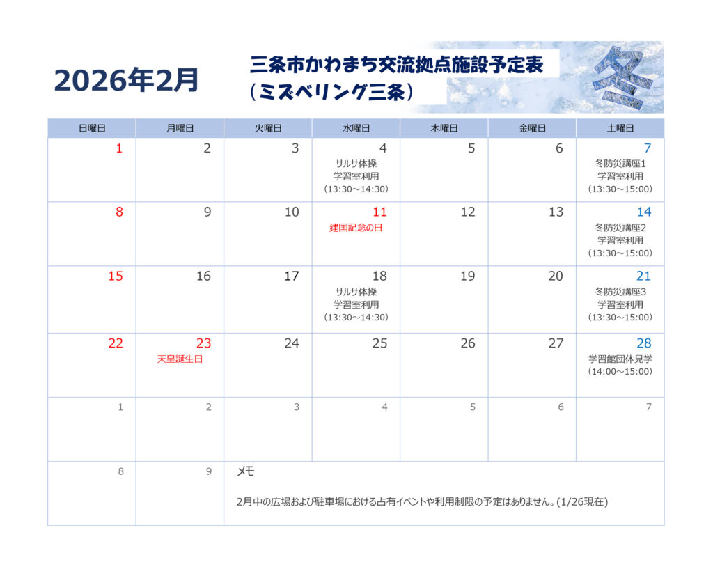 ミズベリング三条の2月の予定表です。
