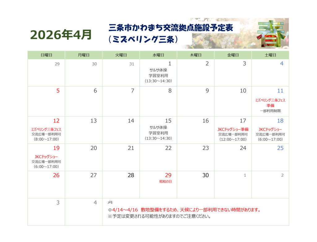 ミズベリング三条の4月の予定表をご案内いたします。