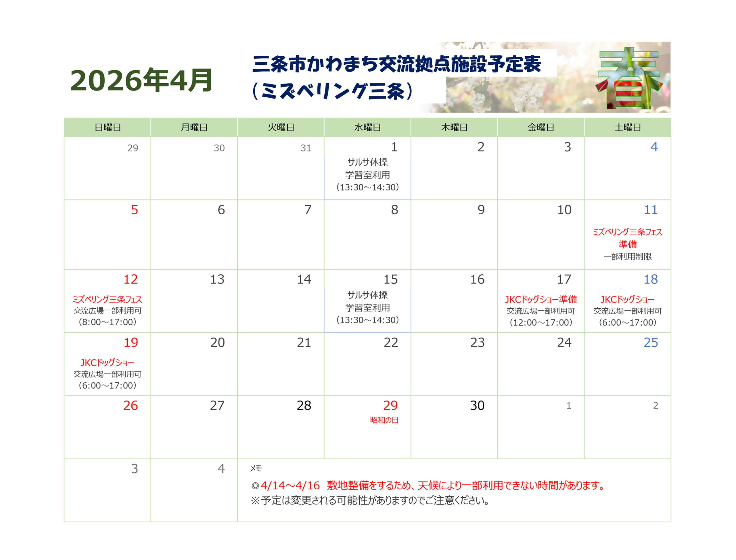 お知らせ2026年4月1日4月の予定表