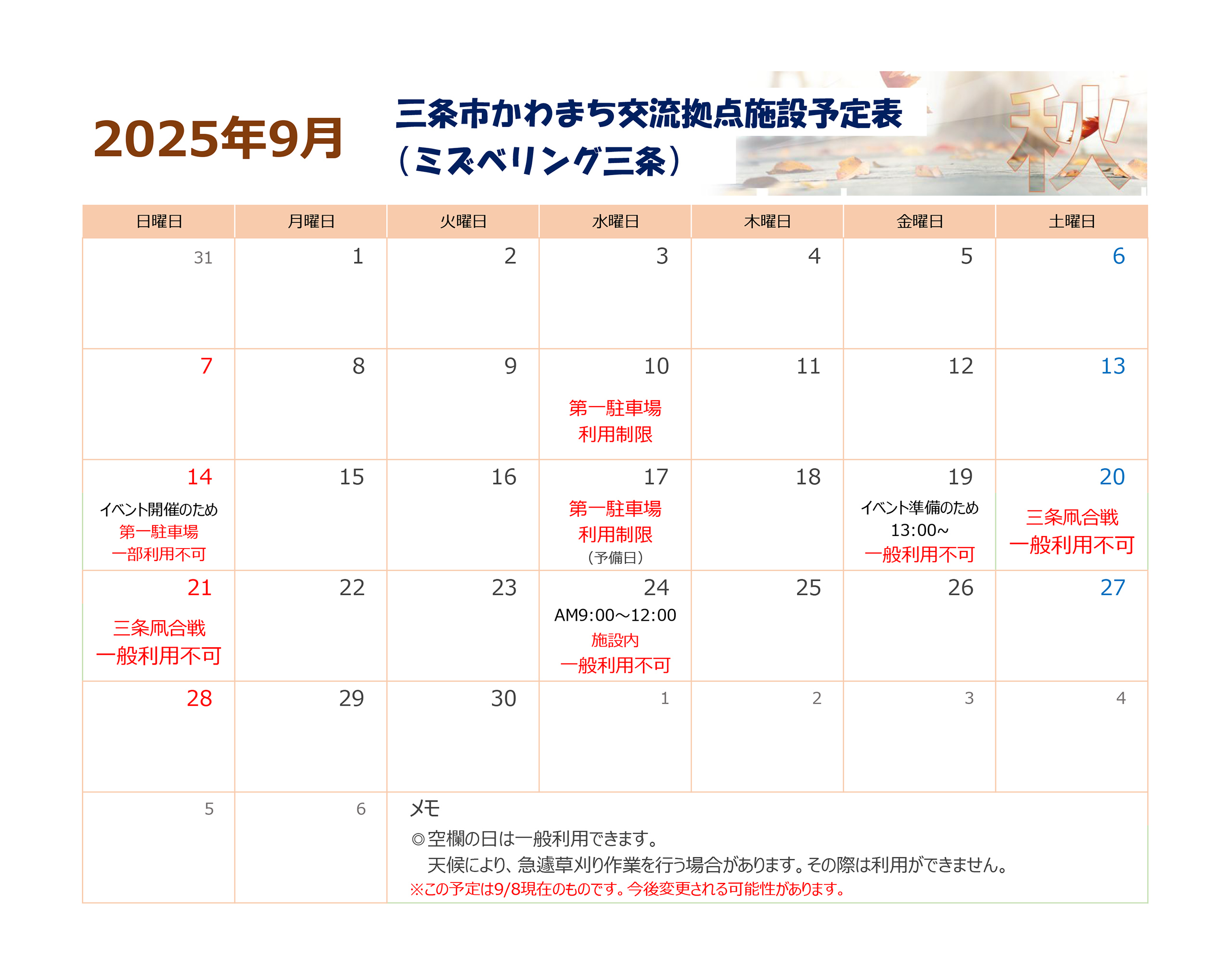 ミズベリング三条の9月のスケジュールに変更が入りましたので、再度お知らせします。